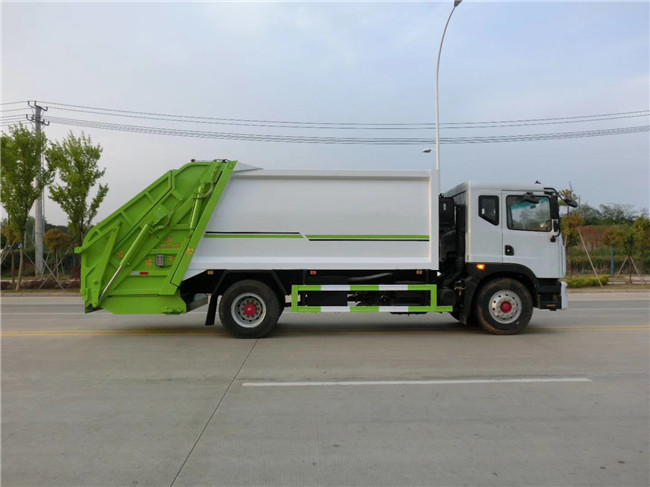 壓縮垃圾車上裝配置:新款平面弧形廂體,廂體材料為武鋼優(yōu)質(zhì)碳鋼,有效壓縮容積10-12立方,PLC一鍵操作控制,手電一體操作模式,兩側(cè)雙電控,帶駕駛室內(nèi)操作,底板支撐加強(qiáng),雙向壓縮,開放式易清潔污水箱。壓縮式垃圾車采用機(jī)電液一體化技術(shù),借助機(jī)、電、液聯(lián)合自動控制系統(tǒng)、電腦控制、手動操作系統(tǒng),通過填裝器和推鏟等專用裝置,實(shí)現(xiàn)垃圾倒入、壓碎或壓扁、強(qiáng)力裝填,把垃圾擠入車廂并壓實(shí)和推卸,污水全部進(jìn)入污水收集箱,解決了垃圾運(yùn)輸過程中的二次污染的問題。壓縮式垃圾車具有自動反復(fù)壓縮以及蠕動壓縮功能,壓縮比高、密封性好、裝載量大﹑操作方便、環(huán)保性好﹑整車?yán)霉β矢叩葍?yōu)點(diǎn)。作業(yè)自動化,垃圾收集方式簡便、高效。后翻轉(zhuǎn)機(jī)構(gòu)選裝:1、掛塑料桶式翻轉(zhuǎn)機(jī)構(gòu);2、掛鐵桶式翻轉(zhuǎn)機(jī)構(gòu);3、擺臂式翻轉(zhuǎn)機(jī)構(gòu); 4、簸箕斗式翻轉(zhuǎn)機(jī)構(gòu)。壓縮垃圾車后部尾部可選裝配置帶筒(或斗)的翻轉(zhuǎn)機(jī)構(gòu),吊裝多容量的桶,240L塑料桶、300L鐵桶、800L小斗、360L塑料桶等。