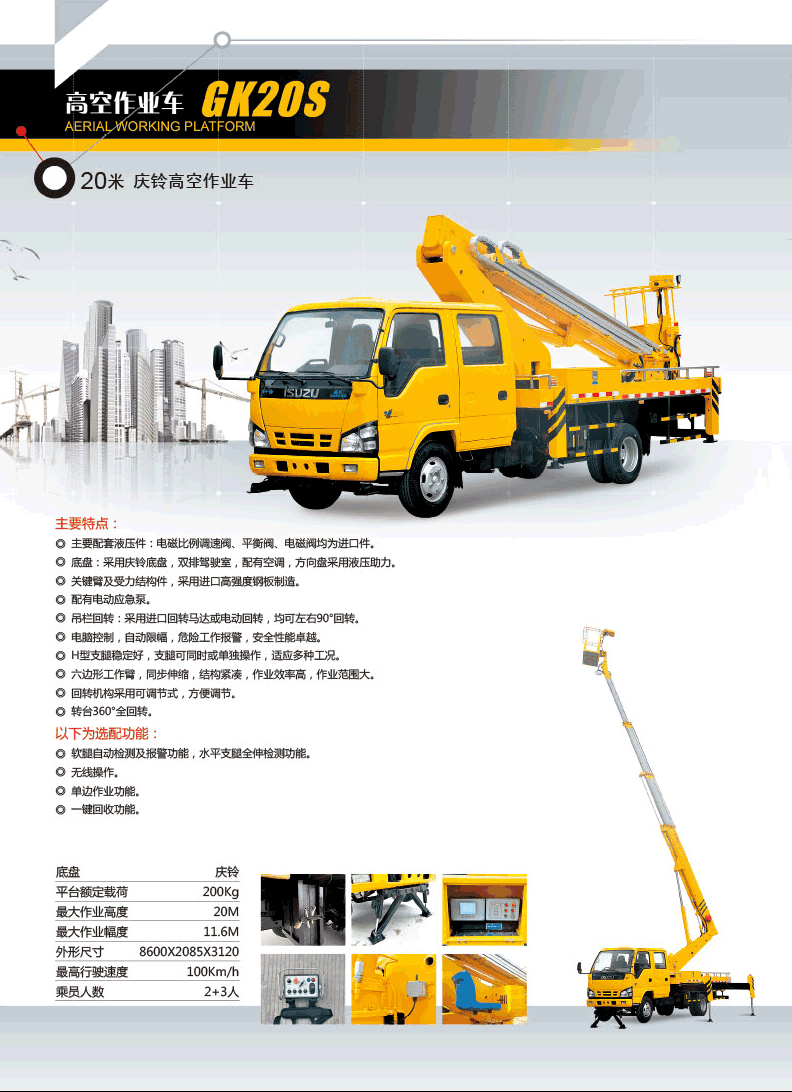 五十鈴高空作業(yè)車專用性能:五十鈴高空作業(yè)車設(shè)備結(jié)構(gòu)簡單,堅固耐用,操作方便可靠。獨特的全回轉(zhuǎn)三折臂液壓操控系統(tǒng)設(shè)計使工作人員操作更平穩(wěn),能更安全的將工作人員送到18米的高空作業(yè),進(jìn)行維修、安裝、清洗、攝影、造船、化工、電力、剪枝、更換路燈及其他工程搶修。