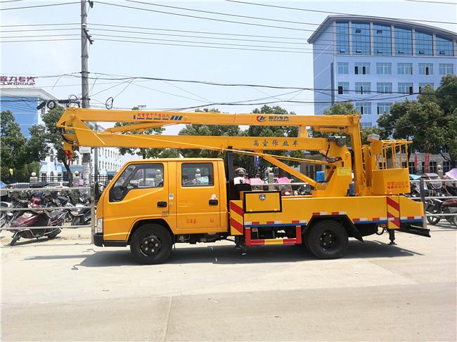 江鈴16米高空作業車配置參數:江鈴順達新款雙排駕駛室,軸距3360mm,配備五十鈴108馬力正宗國五發動機,5檔變速箱,江齒五檔變速箱,7.00R16原廠鋼絲胎.作業高度為14米-16米,液壓360度全回轉,三節折疊臂,折臂系列可選裝1噸吊鉤。單液壓舉升缸,帶雙向平衡閥,電控操作舉升臂,四支液壓油缸可調式支腿帶雙向液壓鎖(支腿操作為手動操作,可單獨控制)、最大作業幅度7.2米、最大起吊高度8米。
