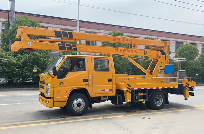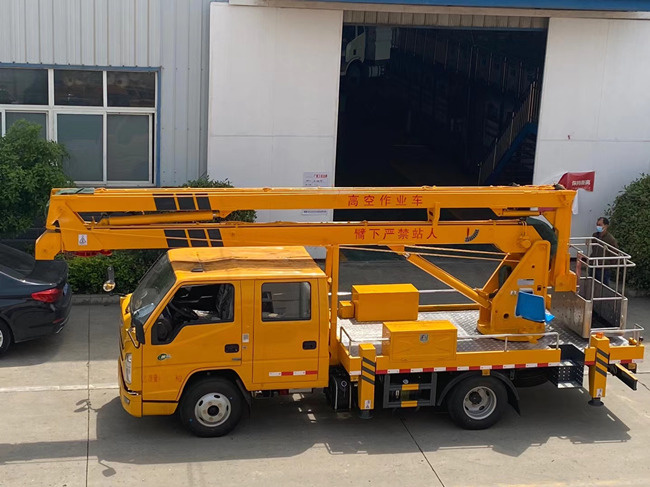 江鈴順達12米高空作業車:采用江鈴115馬力,雙排駕駛室,五檔變速箱,7.00R16鋼絲胎,帶方向助力動力轉向,軸距3360,帶排氣制動,ABS,作業高度16米,工作斗限載200kg,液壓360度全回轉,三節折疊臂,單液壓舉升缸,雙向平衡閥,電控操作舉升臂,1噸可伸縮吊鉤可伸縮1米,四支液壓油缸可調試支腿,帶雙向液壓鎖。