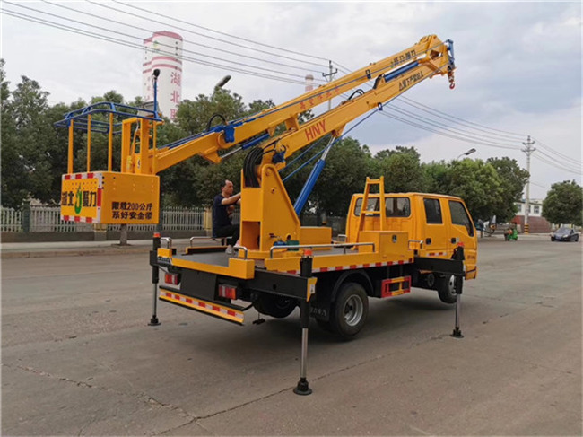 車載式高空作業車移動方便,折臂結構緊湊,強度高、重量輕、直接接入交流電或采用本身直流電源啟動,架設速度快,工作臺即可升高又可水平延伸,還可旋轉,易于跨越障礙物到達工作位置,是高空作業設備。