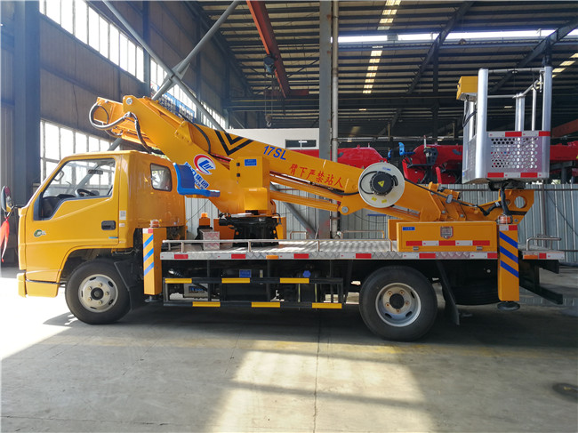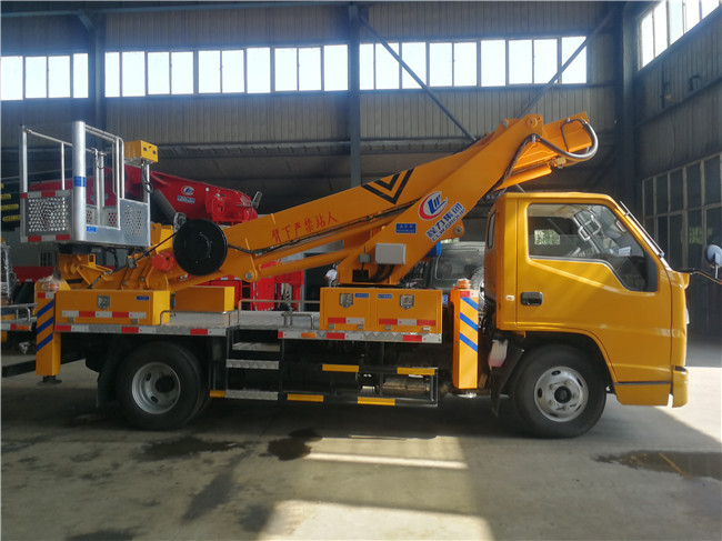 江鈴順達新款雙排駕駛室,軸距3360mm,五十鈴118馬力正宗國六發動機,5檔變速箱,江齒五檔變速箱,7.00R16原廠鋼絲胎. 三節六邊形伸縮臂,最大作業幅度11.6m;最大作業高度:18m;最大作業高度時的作業幅度5m,360°全回轉。前V后H型支腿,支腿橫向跨距(mm)4000,;縱向跨距(mm)4000,;吊藍額定載荷≤200㎏。吊藍尺寸:1100x650X1150,靜液調平,帶油缸鎖止功能,車架和吊藍雙位操作。帶應急動力單元!