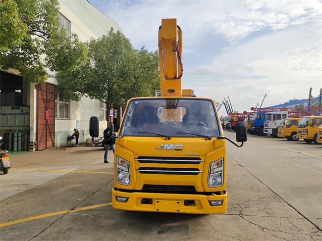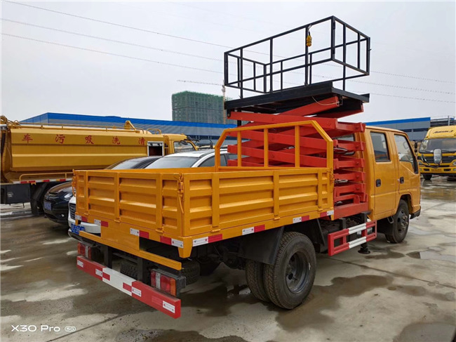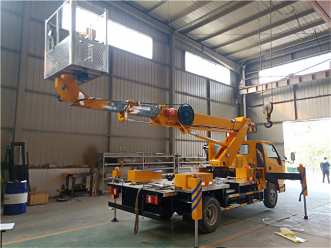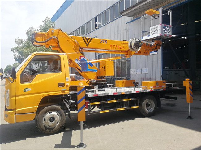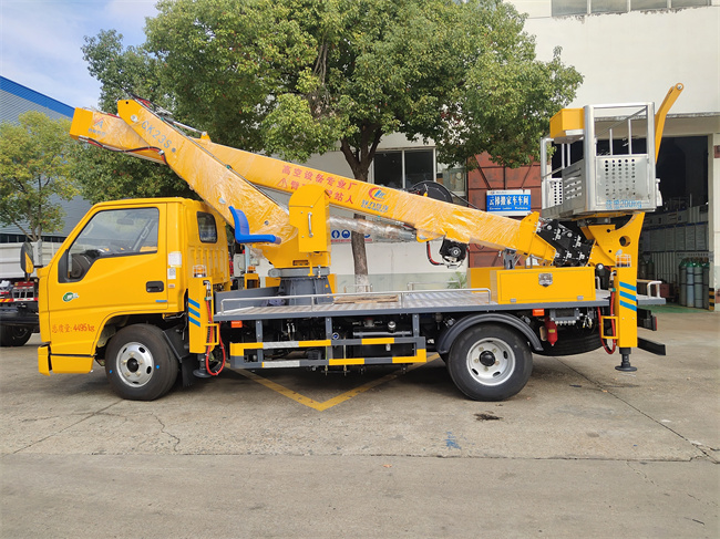 上裝配置:液壓360度全回轉,三節折疊臂,單液壓舉升缸,帶雙向平衡閥,電控操作舉升臂,1噸可伸縮式吊鉤,四支液壓油缸可調式支腿帶雙向液壓鎖(支腿操作為手動操作,可單獨控制)。左右警示燈,黃色車身,全車貼反光標識,雙人穩定作業斗,帶后防護,倆側防護,配一個移動工具箱。