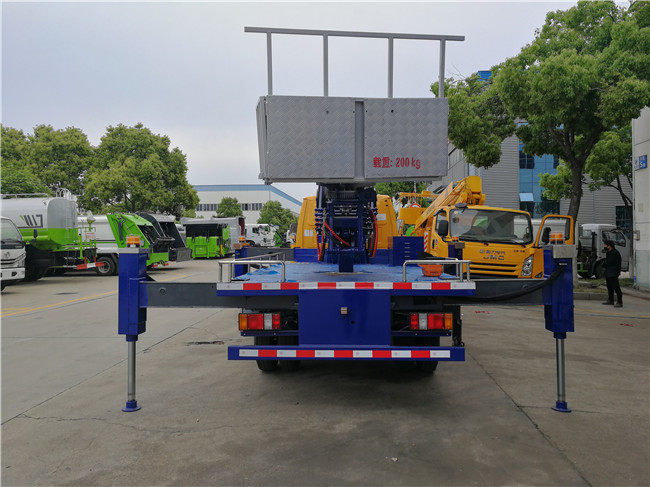 進口21米藍牌高空作業車上裝臂架采用韓國原廠進口,五節工作臂同步伸縮,遙控操作。底車采用江鈴國五/國六底盤。