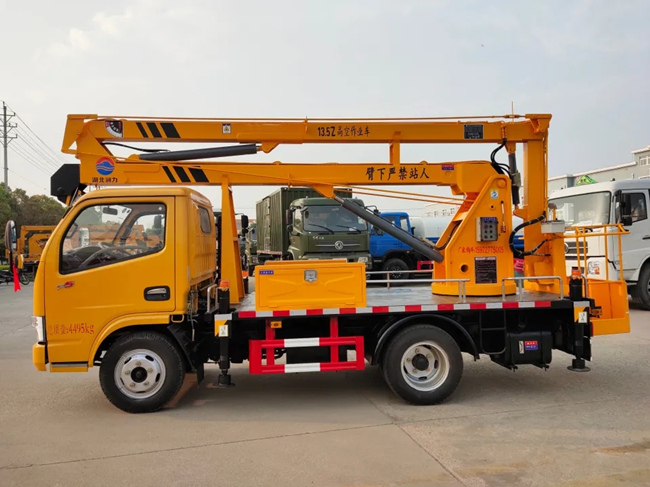 常柴98馬力/全柴110馬力可選,東風單排駕駛室,方向助力,工程黃,電控操作,轉臺和吊籃裝操作,油缸裝有雙向平衡閥,帶油缸鎖止功能,四個液壓支腿單獨可調,支腿與工作臂互鎖,后支腿裝有LED爆閃警燈,轉臺360度液壓全回轉,遠程發動機點熄火功能,不銹鋼護欄,帶一套隨車工具以及安全帶一個。其余按照公司標配。